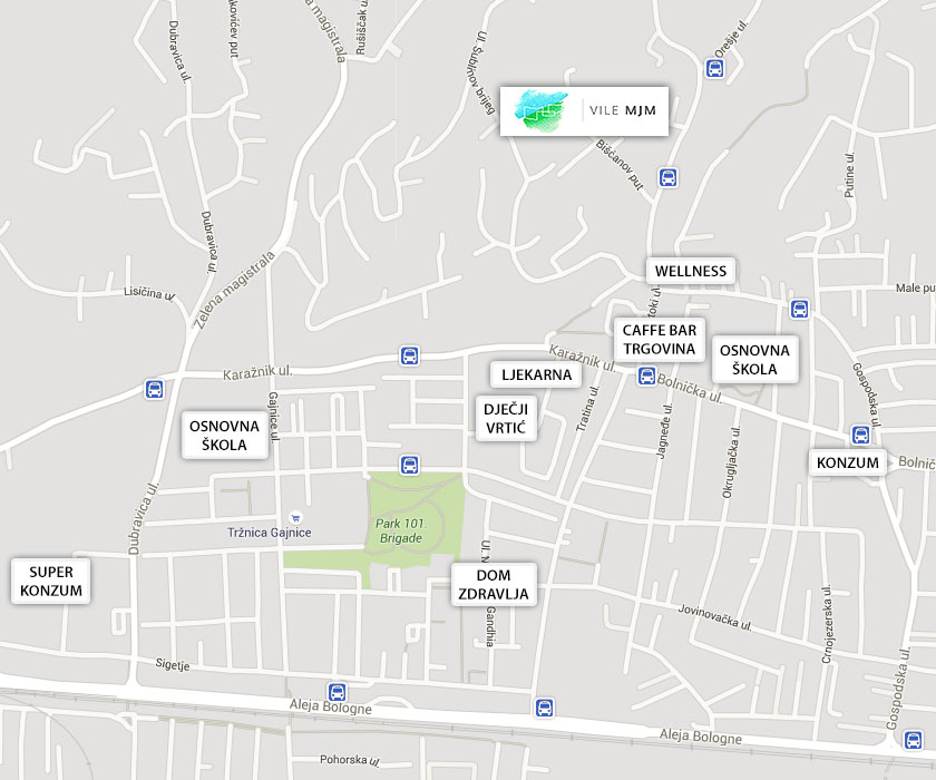 Vile MJM idealno su smještene tako da ugodnom šetnjom za nekoliko minuta možete koristiti sve urbane sadržaje obližnjeg kvarta, ovisno o vašem životnom stilu. Blizina trgovina i tržnica, ljekarne, ambulante, škole, vrtića, glazbene akademije, dječjeg igrališta, nogometnog igrališta, teniskih terena, teretane i ostalih sadržaja svakodnevnicu će svakako učiniti praktičnijom.